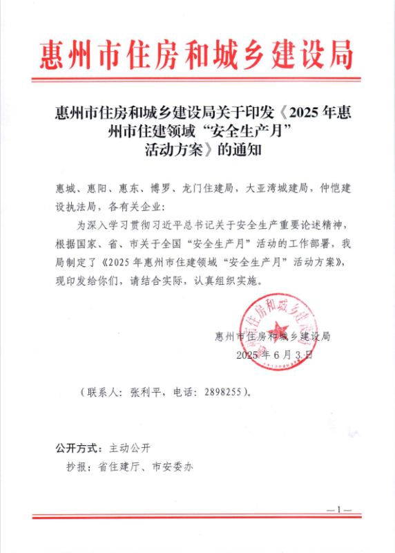 转发 惠州市住房和城乡建设局关于印发《2025年惠州市住建领域“安全生产月”活动方案》的通知